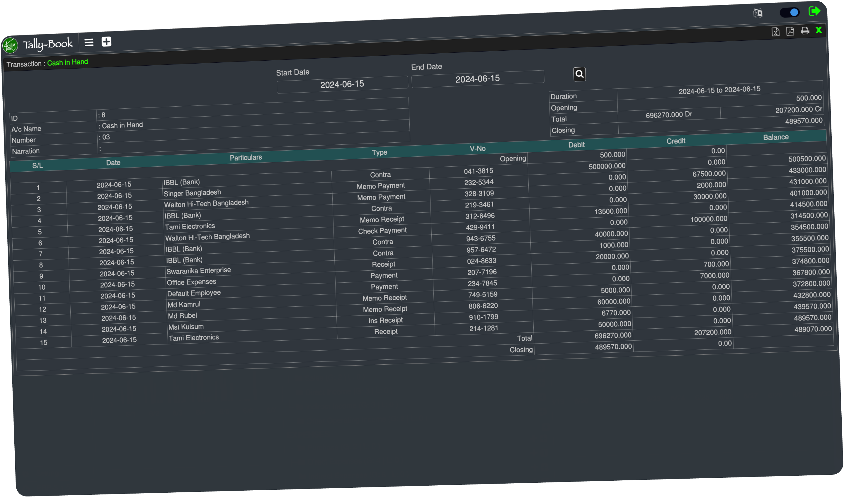 বিজি-ট্যালি হল ব্যবসায়িক প্রক্রিয়া পরিচালনার জন্য ই.আর.পি গুলির অন্যতম সেরা একটি ই.আর.পি । আমাদের ই.আর.পি সমস্ত মূল ব্যবসায়িক ক্ষেত্রগুলির, যেমন ক্রয়, উৎপাদন, উপকরণ ব্যবস্থাপনা, বিক্রয়, বিপণন, অর্থ এবং মানব সম্পদ (HR), পে-রোল, কাঁচামাল, ক্রয় আদেশ এবং উৎপাদনের ক্ষমতা সহ প্রচুর তথ্যের ট্র্যাক রাখে।